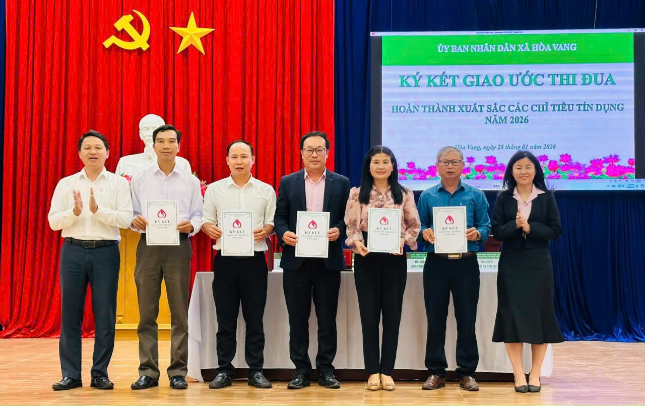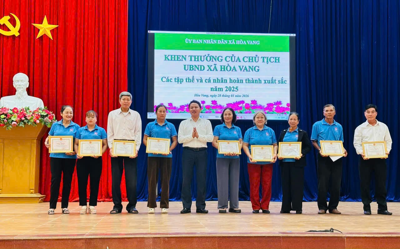 Nhân hội nghị, UBND xã Hòa Vang khen thưởng cho 02 tập thể và 10 cá nhân có thành tích xuất sắc trong hoạt động tín dụng năm 2025. Đồng thời phát động và ký kết thi đua giữa các Hội đoàn thể nhận ủy thác năm 2026.